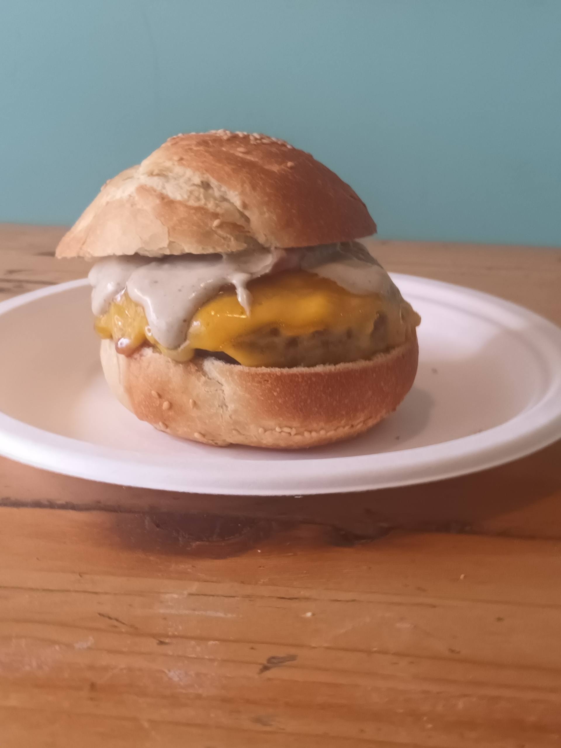 Doble de cheddar, doble de bacon, huevo, lechuga, tomate, cebolla, salsa Cebrián.